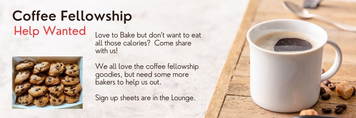 Sign up sheets available for coffee fellowship slots in the lounge. Make sure to grab your time before they are all gone!